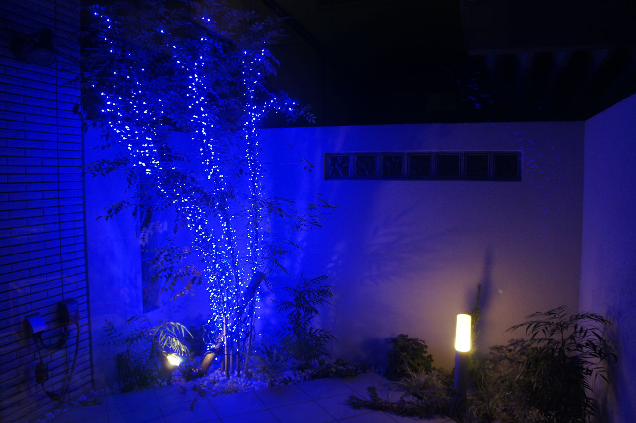 テラスの木をクリスマスツリーに ブルーのledでイルミネーション 電気代は意外と安い I Smart Looking House 一条工務店で個性派住宅